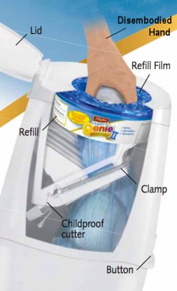 And when you rub that lamp, SIM SALAABIM… The Diaper Genie comes out and grants you 3 wishes, all of which are “MAKE IT STOP BECAUSE MY EYESOCKETS ARE BURNING!” Also known as “The Ghost Of Breakfast Past,” the DG upper-chamber traps all the up-waft of the dipe-loads of the deep. You pop that top and get an odiferous uppercut of kid butt. I’d rather a Sta-Puft Marshmallow Man threaten my high-rise.